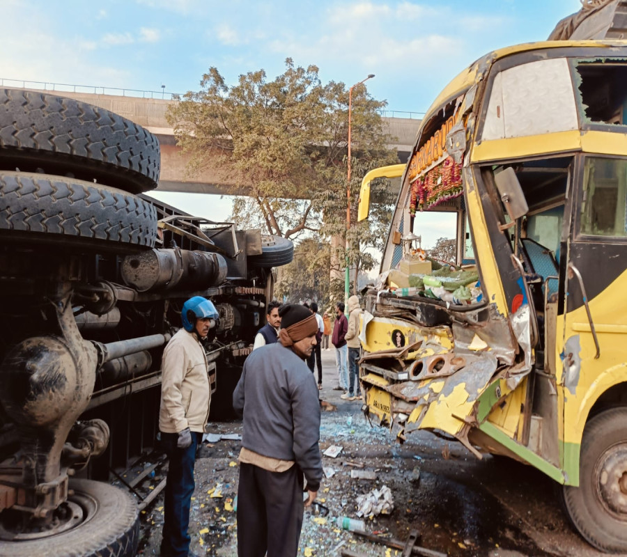 सरकार उपकार बस ड्राइवर ने लापरवाही पूर्वक गाड़ी चलाते हुए किया एक्सीडेंट, सामने से क्रोस कर रहे कंटेनर को मारी टक्कर जिसमें कंटेनर पलटा