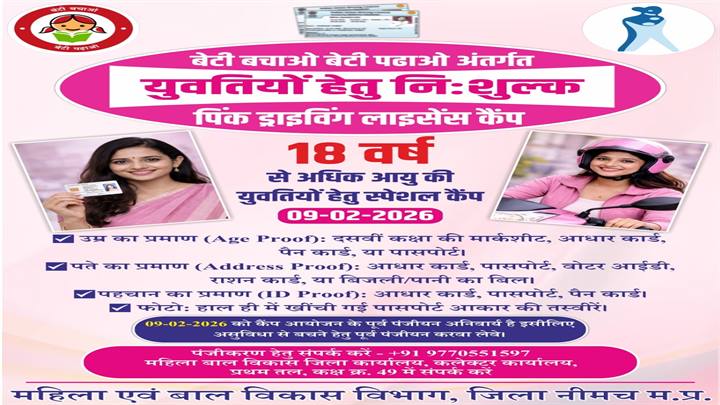 बेटी बचाओ, बेटी पढ़ाओ योजना तहत पिंक ड्राइविंग लाइसेंस शिविर 9 फरवरी को