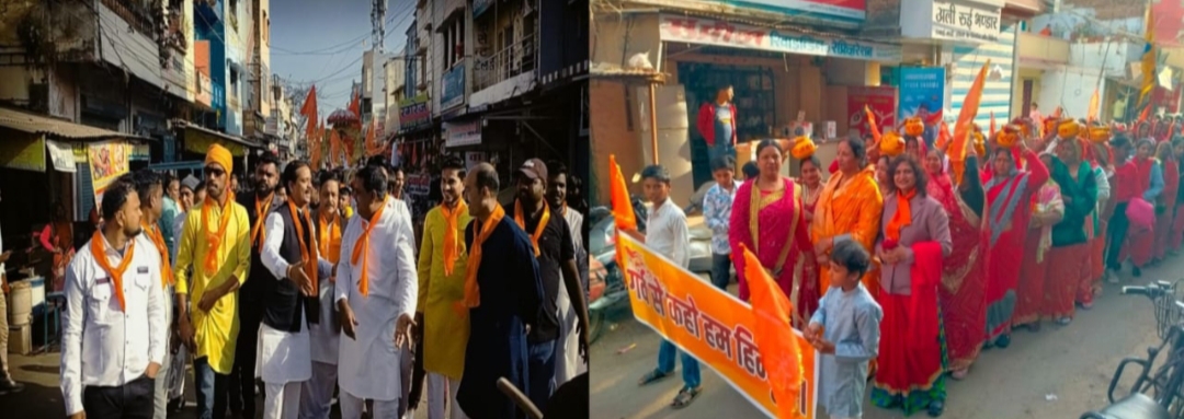 नीमच । रविंद्र नाथ टैगोर बस्ती क्षेत्र वासियों द्वारा 4 जनवरी को दोपहर 3 बजे बारादरी चौराहे के समीप नया बाजार स्थित श्री बड़े बालाजी मंदिर में पूजा अर्चना के बाद टैगोर बस्ती हिंदू सम्मेलन का शुभारंभ मंगल कलश शोभा यात्रा से किया गया। शोभा यात्रा श्री बड़े बालाजी मंदिर से श्री राम चौक, नरसिंह मंदिर, घंटाघर कमल चौक, महेश सर्कल, शहीद हेमू कॉलोनी चौराहा होते हुए स्वर्णकार धर्मशाला पहुंचकर हिंदू सम्मेलन धर्म सभा में परिवर्तित हो गई। शोभा यात्रा में सबसे आगे रथ पर राम की प्रतिमा स्थापित की गई दो युवक स्वर्ण लाल पीतांबरी छतरी लिए चल रहे थे। डीजे बैंड बाजे पर मेरी झोपड़ी के भाग खुल जाएंगे.. आज राम आएंगे भजन पर नन्ने मुन्ने बच्चे नृत्य कर रहे थे। इसके साथ ही अनेक बच्चे भगवा ध्वजा लहरा रहे थे। युवक मंदसोरी ढोल पर युवा झूम रहे थे। महिलाएं अमृत मंगल कलश सिरोधार्य किये चल रही थी। भगवा ध्वजा से सजी बग्गी में श्री बड़े बालाजी मंदिर के महंत पंडित जानकी दास जी पुजारी विराजित थे। शोभा यात्रा का मार्ग में स्थान स्थान पर पुष्प वर्षा से स्वागत किया गया।